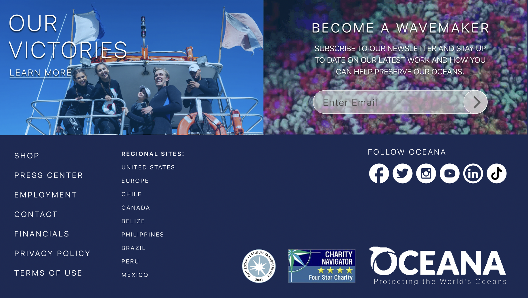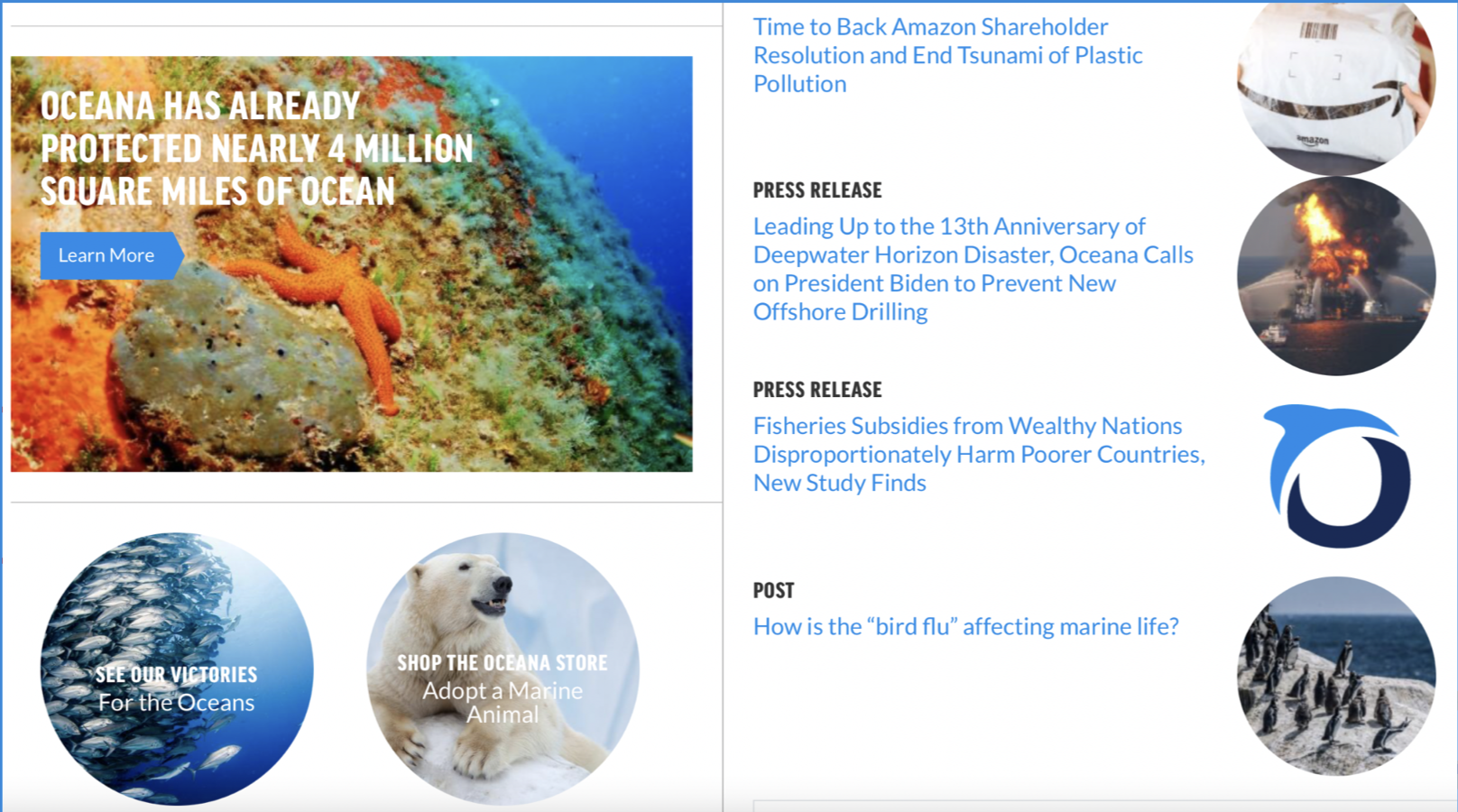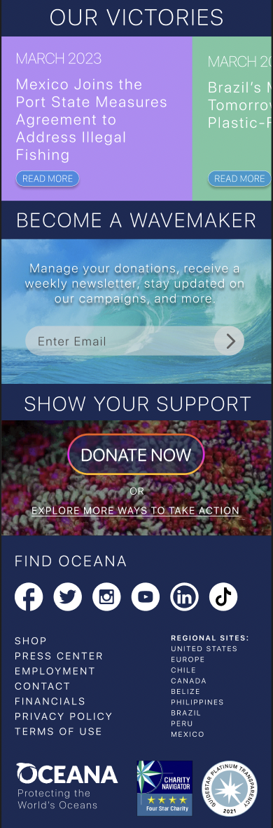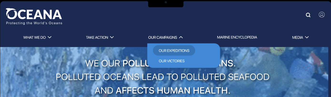 Revamp the website by emphasizing Oceana's mission prominently and implementing an intuitive navigation, ensuring users can easily explore and navigate the site with clarity and coherence.